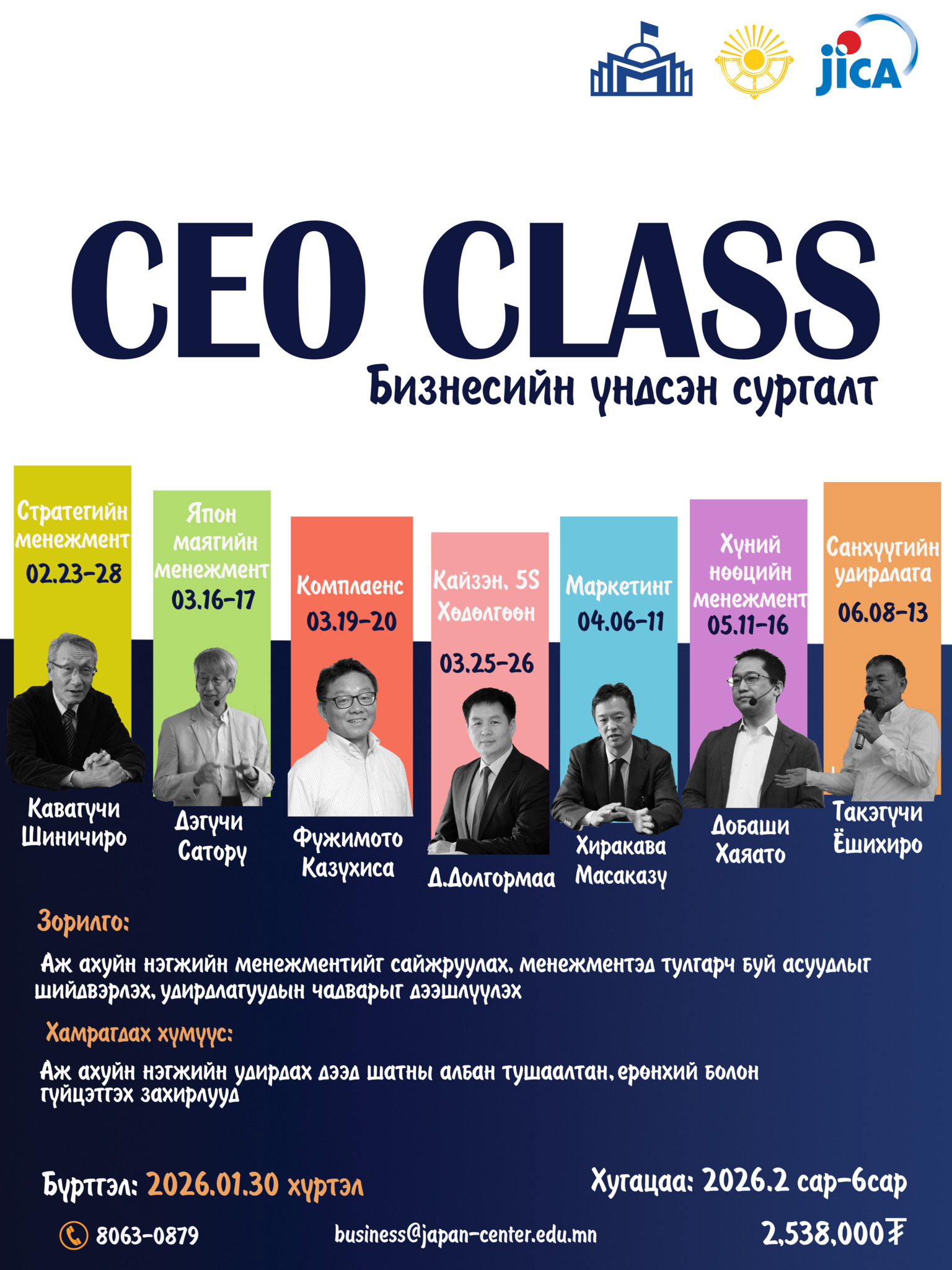 Энэхүү сургалтаар богино хугацаанд Япон маягийн менежмент, Комплаенс, Стратегийн менежмент, Маркетинг, Хүний нөөцийн менежмент, Санхүүгийн удирдлага, Кайзэн 5S хөдөлгөөн гэсэн үндсэн 7 сэдвээр суралцаж, компанийн менежментийн талаар цогц мэдлэг, чадварыг эзэмшиж, байгууллагадаа амжилттай хэрэгжүүлэх арга замуудаас суралцана. Удирдлагын ангид нэмэлтээр бизнесийн практик сэдэвт сургалтуудаас нэг сэдэв хичээл сонгон суралцана.