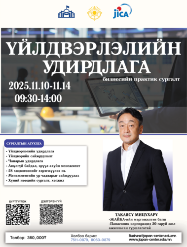 ҮЙЛДВЭРЛЭЛИЙН ЧАНАР, ДАМЖЛАГАА САЙЖРУУЛАХАД ШААРДЛАГАТАЙ МЕНЕЖМЕНТИЙН УР ЧАДВАРТ СУРАЛЦАХЫГ ХҮСВЭЛ МОНГОЛ-ЯПОНЫ ТӨВИЙН “ҮЙЛДВЭРЛЭЛИЙН УДИРДЛАГА” СЭДЭВТ СУРГАЛТАНД ХАМРАГДААРАЙ.