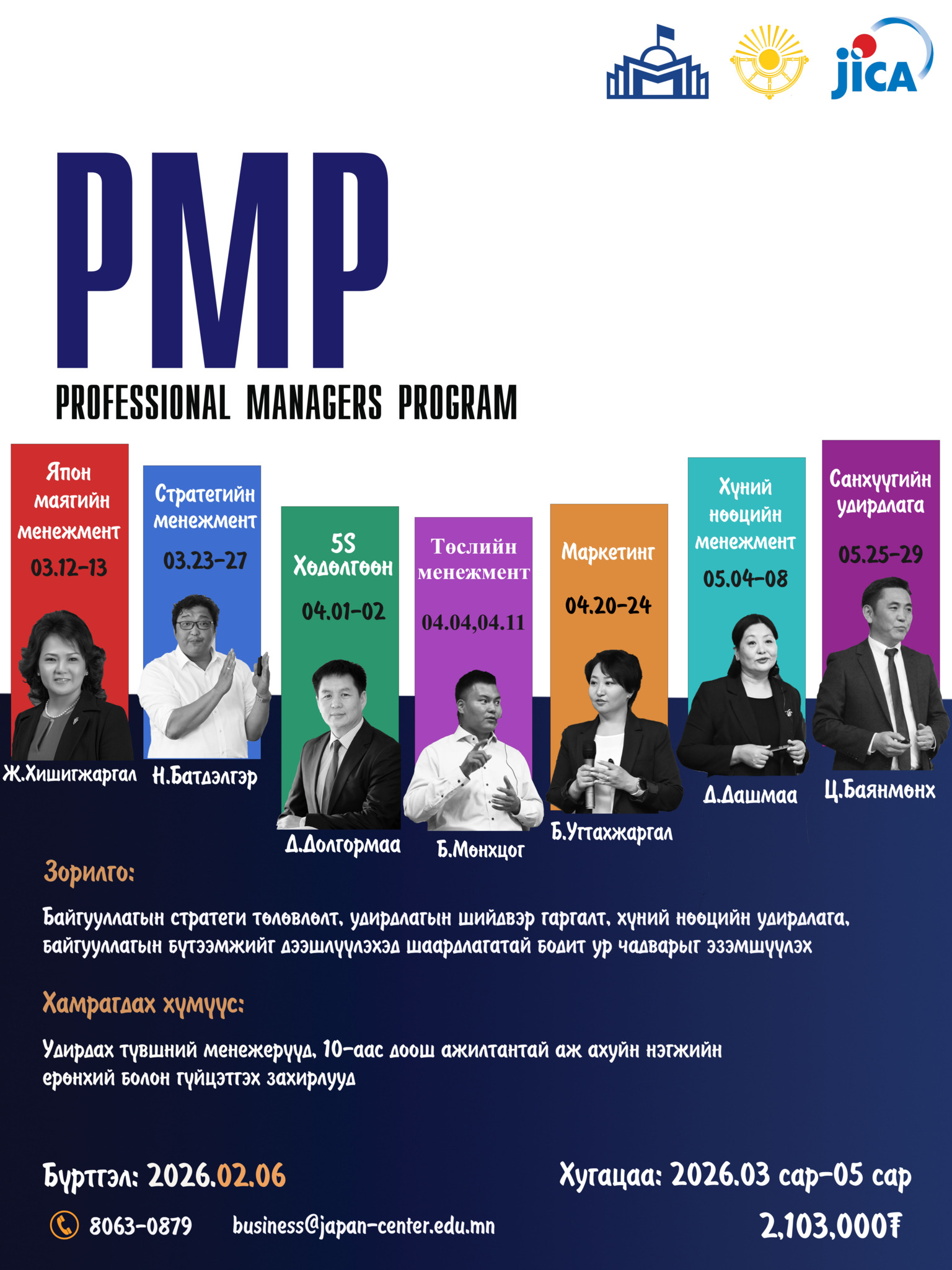 "Professional Managers Program" буюу “Удирдах түвшний менежерүүдэд зориулсан практик сургалт” нь байгууллагын стратеги төлөвлөлт, удирдлагын шийдвэр гаргалт, хүний нөөцийн удирдлага, байгууллагын бүтээмжийг дээшлүүлэхэд шаардлагатай бодит ур чадварыг эзэмшүүлэх зорилготой. Уг хөтөлбөр нь орчин үеийн менежментийн шилдэг туршлага, бодит кейс судалгаа, багийн дадлага ажилд суурилсан практик сургалтаар дамжуулан менежерүүдийн манлайлал, асуудал шийдвэрлэх чадамжийг хөгжүүлэхэд чиглэнэ.