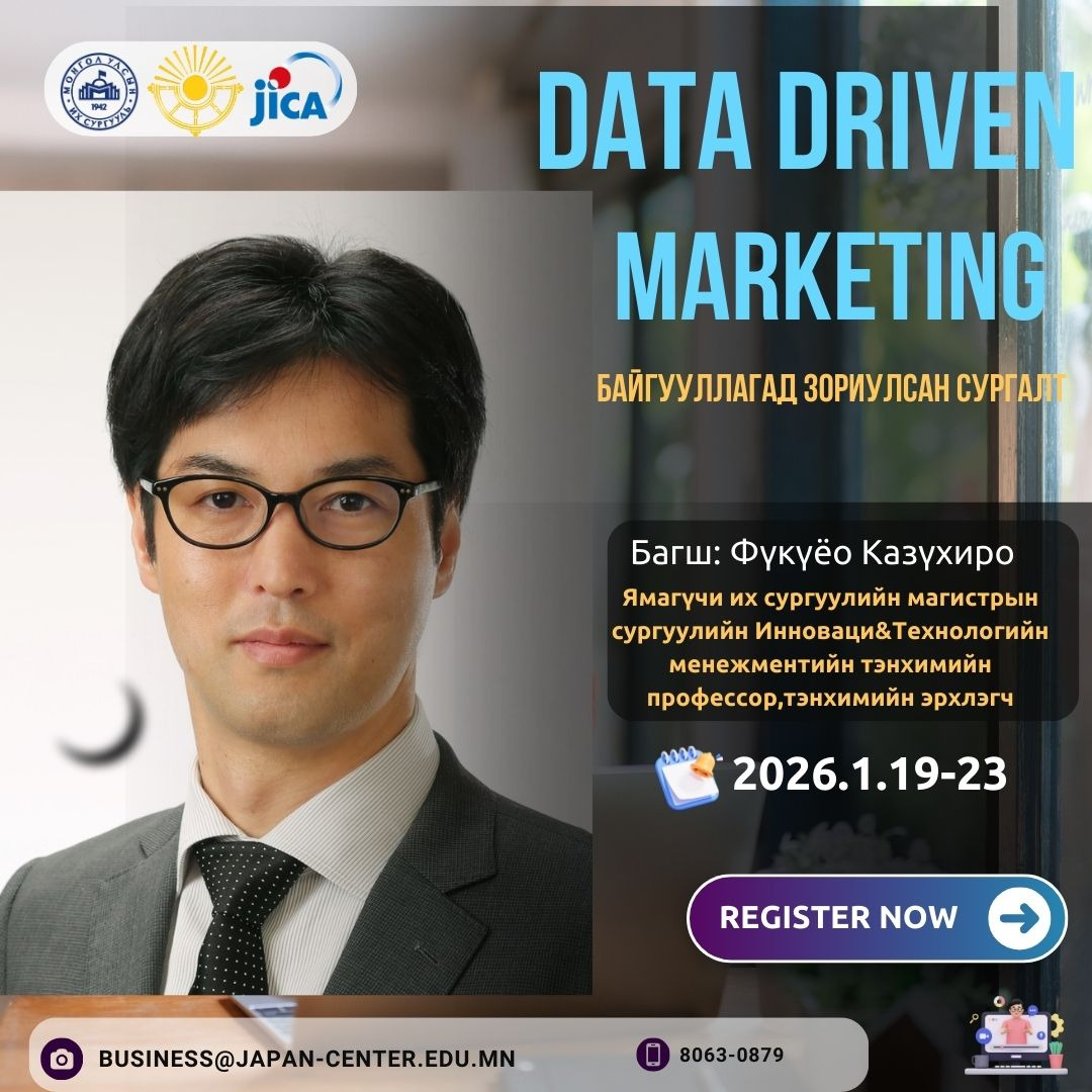 2026 оны 1 сарын 19-нөөс 23-нд Датад суурилсан маркетинг сургалтын япон мэргэжилтэн багш Фүкүёо Казүхиро Монголд ирэх тул байгууллага дээрээ сургалт авахыг хүсвэл бидэнтэй холбогдоорой.